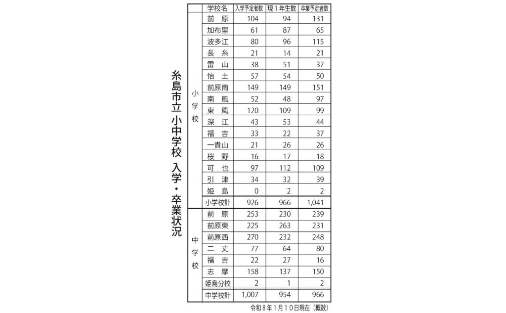 糸島市学校教育課によると、今春の市内16の小学校に入学予定の新1年生は、926人(1月10日現在の概数)。昨年比で40人減り、減少傾向が続いている。市内の中学校7校(姫島分校を含む)の新1年生は、1,007人の予定。 小学校で最も入学者が多いのは、... -