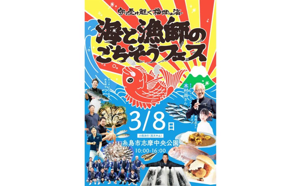 志摩中央公園 福岡の海の魅力や魚食文化を楽しく学ぶ体験型イベント「海と漁師のごちそうフェス」が3月8日、糸島市の志摩中央公園で開かれる=写真はチラシ。午前10時から午後4時まで。入場無料。 会場には漁業者直営ブースが並び、海鮮丼やカキ焼... -