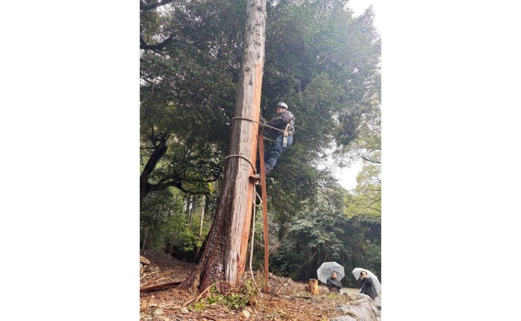 【糸島市】檜皮葺用の採取を実演