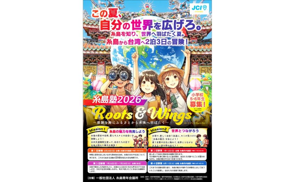 青年会議所が「糸島塾」 この夏、糸島から世界へ-。子どもたちが地域の魅力を見つめ直し、台湾で異文化に触れる体験型プログラム「糸島塾2026~Roots&Wings~感謝を胸にふるさとから未来へ羽ばたく」の参加者を、糸島青年会議所が募集している=写真は... -