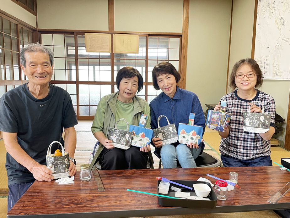 地域住民4人が参加。和やかな雰囲気の中、インストラクターの指導を受けながら、空き瓶を使って折り目を付けたり、筆でのりを塗って貼り付けたり。「のり付けの前に手を入れて袋がちゃんと開くか確認してください。貼る場所を間違えるとバッグになりませんよ」との声かけに、思わず笑い声があがる中、参加者たちは熱心に手を動かした。