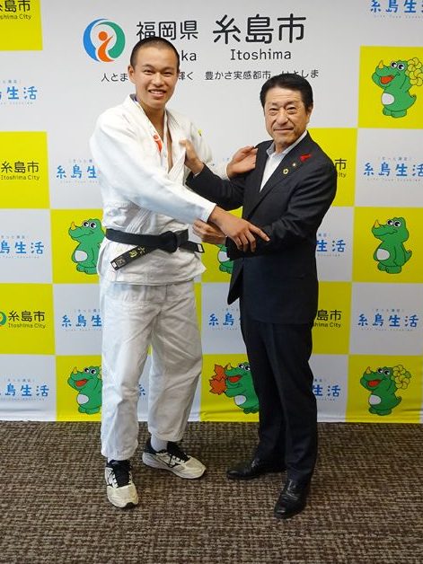 全国中学校柔道大会の男子81キロ級で、3位入賞を果たした志摩中3年生の六角悠玄選手(15)が2日、糸島市役所を訪れ、月形祐二市長に結果を報告した=写真。