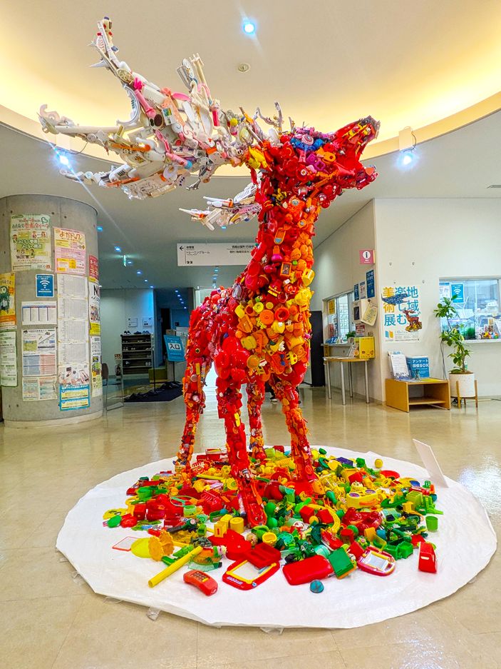 招待作家は糸島市在住の藤浩志さんと福岡市在住のしばたみなみさん。藤さんは、プラスチックのおもちゃ類で、絶滅したシカの仲間を制作した作品、しばたさんは海や街で出会った廃材を用いたインスタレーションを展示している。入場料無料。