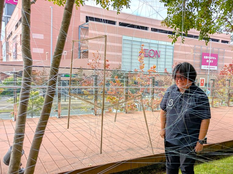 入選作品は、空間全体を使った現代美術のインスタレーションや油彩画、水彩画、鉛筆画、切絵、陶芸、写真。西区在住の徳永昭夫さんのインスタレーションは2階テラスに植えられた木々に、ポリロープを張り巡らし、その中に麻ひもを使い、向かい合った二つの椅子を表現。一つは、さいとぴあの北にある九州大学、もう一つは南にある古墳を表し、それぞれの時代に生きた命が自由な対話をしているさまをイメージさせる作品となっている。