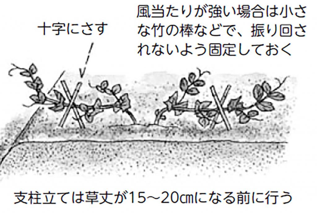 翌春には、1株から多くの側枝が株元から出るので、春先早めに1株3~5本立てに刃物で間引き、風通し、日当たりをよくします。つるが伸び始めたら2メートル以上の支柱を立て、ひもで誘引します。さやがつき始めたら追肥を行ってください。
