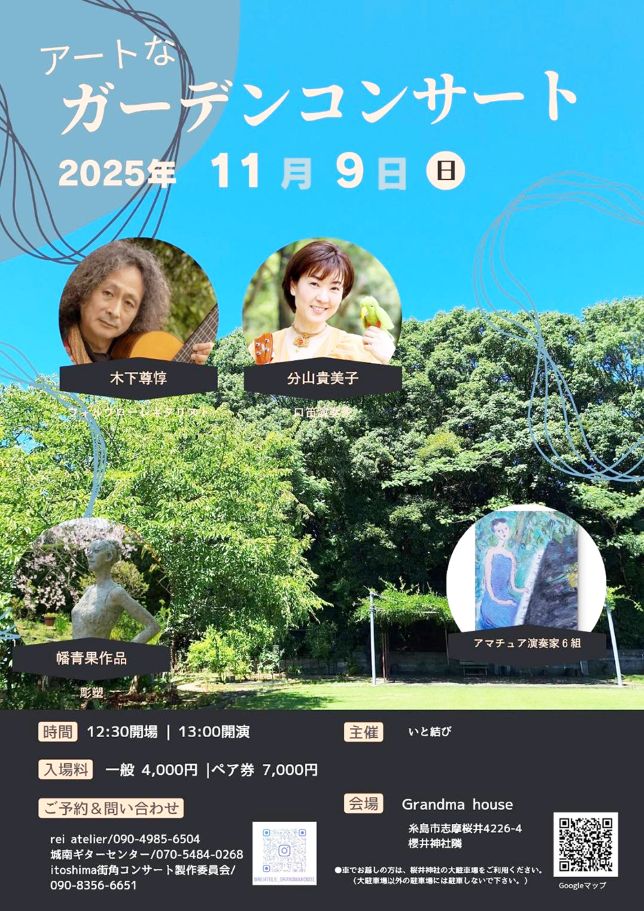 木々に囲まれた芝生の庭で音楽を楽しむ「アートなガーデンコンサート」(いと結び主催)が11月9日、糸島市志摩のグランマハウスで開かれる。南米のフォルクローレギタリストや口笛演奏家、久留米工業大学吹奏楽団など、多彩なジャンルのアーティストが集い、秋空の下で野外ライブを繰り広げる。