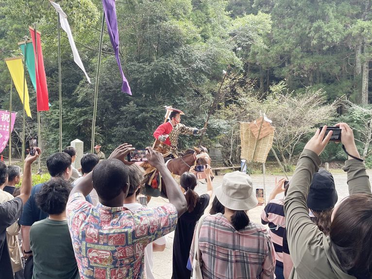 雲の切れ間から青空がのぞく中、江戸時代から受け継がれてきた流鏑馬神事が勇壮に披露された。馬が境内を駆け抜ける中、射手(いて)が矢を放ち、的に見事命中すると、見物客からは大きな拍手と歓声が上がった。