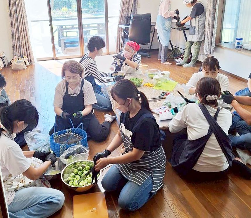 ゆずこしょうは、農園で採れたものを中心に、約10キロのユズと青唐辛子を使用。ユズの皮と青唐辛子を細かく刻んだものを塩と混ぜ、ユズの搾り汁も少し入れるのがポイント。残ったユズの搾り汁で、ポン酢も手作りした。かんきつのさわやかな香りが部屋に満ち、参加者たちは「鍋やみそ汁にゆずこしょうを入れるとおいしそう」と和気あいあいと作業していた。