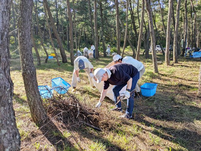 「いとしま結婚応援団」(小島忠義団長)は10月11日、地域貢献活動の一環として、糸島市二丈の福井浜で松林の清掃活動を行った=写真。応援団は、同市が区画割りした松林で清掃・美化活動を行うアダプト事業の登録団体。この日は、松林保存会(蓑田昌治会長)のメンバーや市職員も手伝い、15人が参加。約3千平方メートルの区画に散らばっている枝を拾い集めていった。