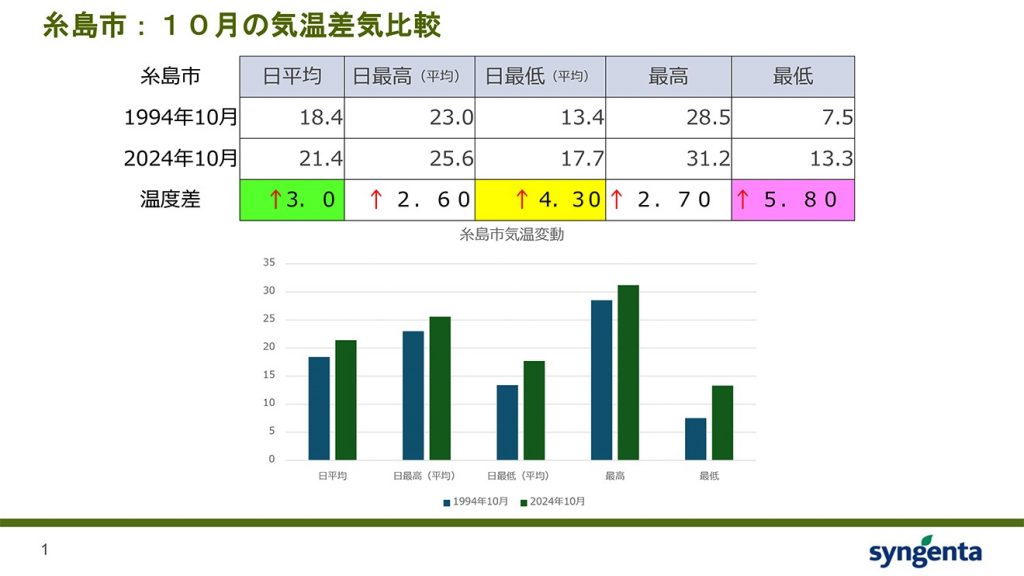 前原地点は過去データが少ないので、1994年と2024年の気温差比較。福岡地点は、私が生まれた1964年と、1994年、2024年の比較で、それぞれ秋の10月、年が明けての冬の1月、春の3月について比べてみました。別表を参照してください(データからの抽出なの正確性は低いです)。