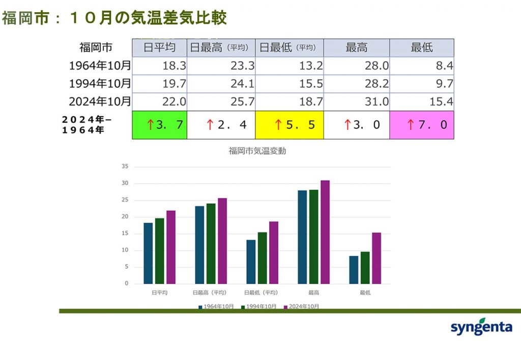 福岡での60年前の10月と昨年同月をみると、3.7度上昇。1月は1.6度上がり、3月は4.2度上昇していました。秋に気温が上昇する傾向があり、冬本番の1月は目立った気温の変化は起きていませんが、春先の3月になると、気温の上昇がみられています。