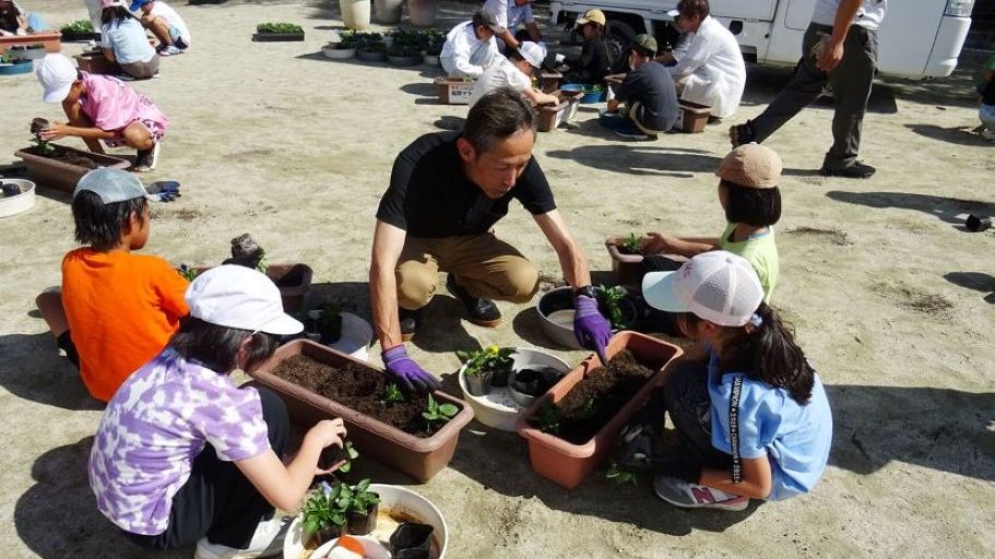 1個のプランターには5色の苗を植える形で作業が進められ、160のプランターが完成。子どもたちは持続可能な開発目標(SDGs)の観点から、雑草を肥料化する活動にも取り組んだ。