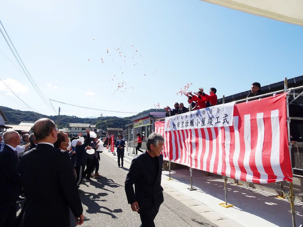 しゅん工式には漁業関係者や市関係者ら約60人が出席し、もちまきで完成を祝った=写真。同漁協の仲西利弘組合長は「カキ小屋は、冬の水産業を支える核であり、食品衛生管理の向上などを図るため、常設事業に着手した。これからも地域の漁業の振興と安心安全な水産物の供給に努めたい」と話した。