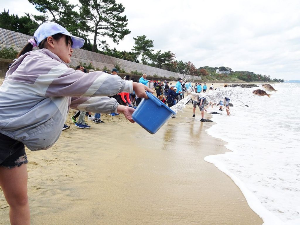 「海を守ろう」と、糸島ロータリークラブ(RC)は10月28日、糸島市の福吉海岸で、福吉小の児童や福吉保育園・幼稚園の児童ら約130人と稚魚放流を行い、同クラブの会員らが海岸清掃に取り組んだ。