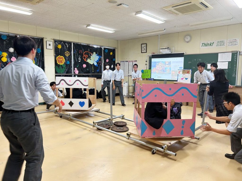 クラス展示では、お化け屋敷や縁日など、どのクラスも趣向を凝らした企画を披露。2年7組はミニアトラクション「コーヒーカップ」を手づくりし、設計から調整までを1週間で仕上げた。「クラスのみんなと力を合わせて作り上げる過程がとても楽しかった。たくさんのお客さんが来てくれてうれしい」と生徒たちは声を弾ませた。糸島市から訪れた中学生は「手づくり感があって、遊園地では味わえない楽しさがありました。高校生が優しく声をかけてくれた」と笑顔を見せた。