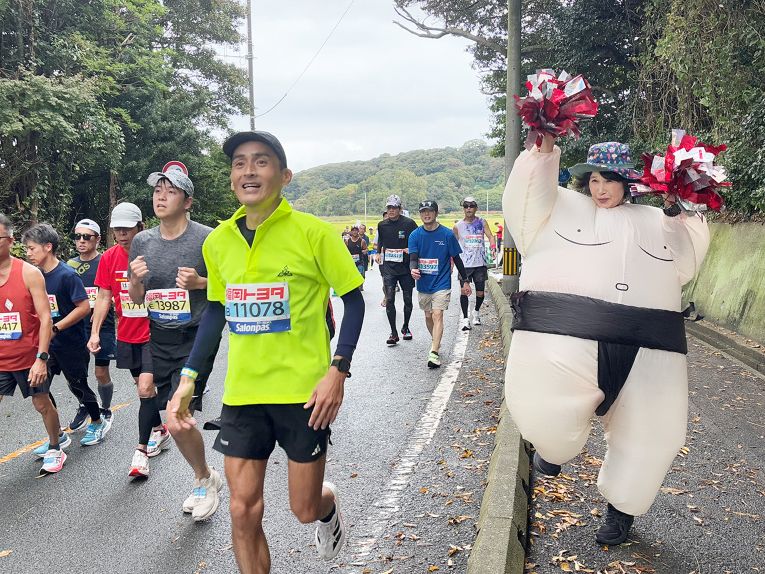 福岡市西区北原の安部友啓さん(49)は、九州大学時代のサークル仲間である渡邊敬之さん(48)とそろって完走。渡邊さんは現在東京に住んでいて、6年ぶりに福岡を訪れた。「海を見ながら走るのは本当に気持ちよく、応援も温かかった。2人で走れて心強かった」と旧交を温めていた。