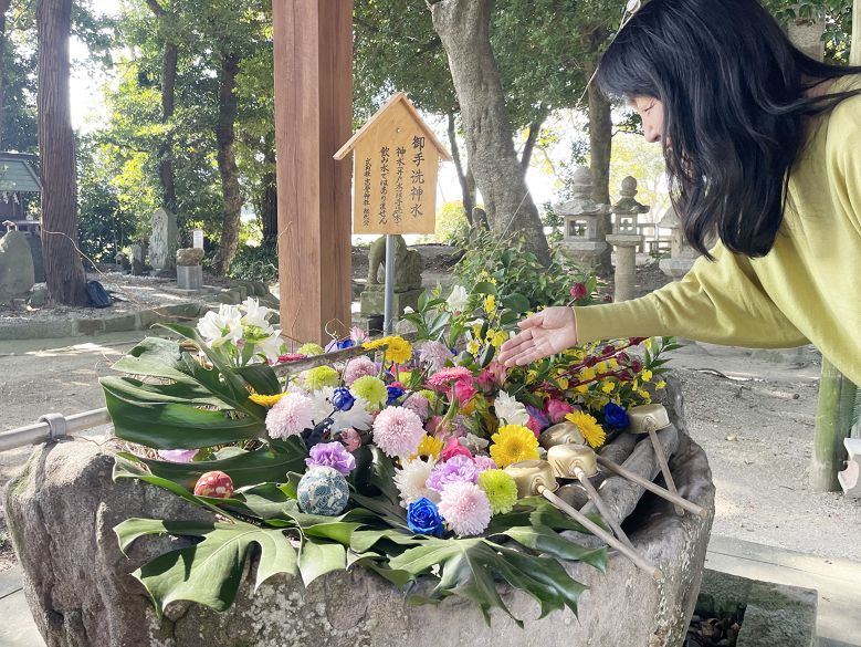 神社の手水鉢を花々で彩る「糸島花手水」(JA糸島花卉(かき)部会・福岡県共催)が1日から、糸島市内の神社で開催されている。