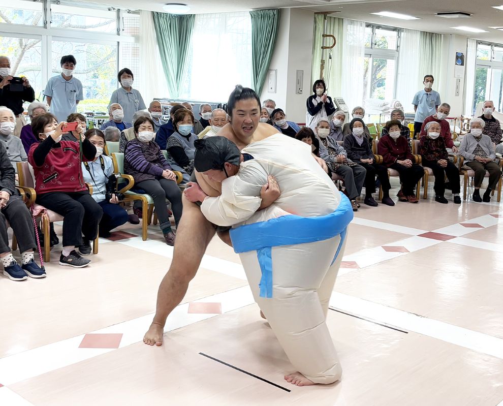 最後は力士たちが会場を回り、握手や写真撮影をして交流を深めた。デイケアを利用する80代の女性は「いつも錦木関をテレビで応援しているので、実際に会えてとてもうれしい。これからの力になります」と声を弾ませ、握手の感触を確かめていた。