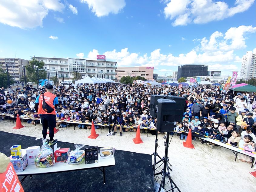 会場では、キッチンカーやゲームブース、整骨院による指圧マッサージなど多彩な出店が並んだ。祭りの締めくくりには、最新のゲーム機「スイッチ2」などが当たる大抽選会が行われ、会場は熱気に包まれていた=写真。