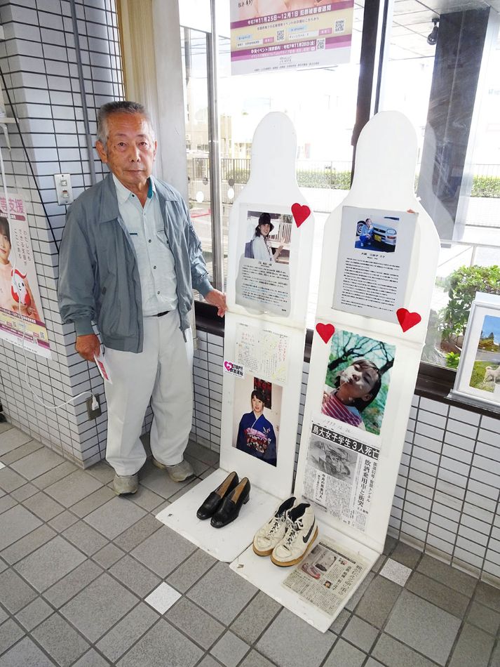 犯罪被害者等支援広報啓発強化期間(12月1日まで)に合わせ、「生命(いのち)のメッセージ展」が10日から21日まで、糸島署1階ロビーで開かれた。飲酒運転事故の悲劇を風化させず、命の尊さを伝えるため、被害者の顔写真や遺族のメッセージが付された等身大パネル「生命のメッセンジャー」と遺品などが展示された=写真。