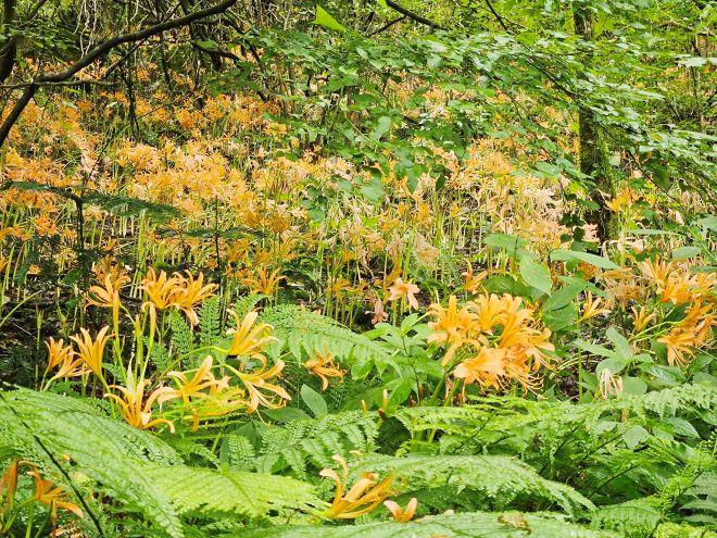 オオキツネノカミソリは、ヒガンバナ科の多年草。開花は7月中旬から下旬頃で、水無登山口付近からオレンジ色の花々が登山道沿いを一面に彩る。