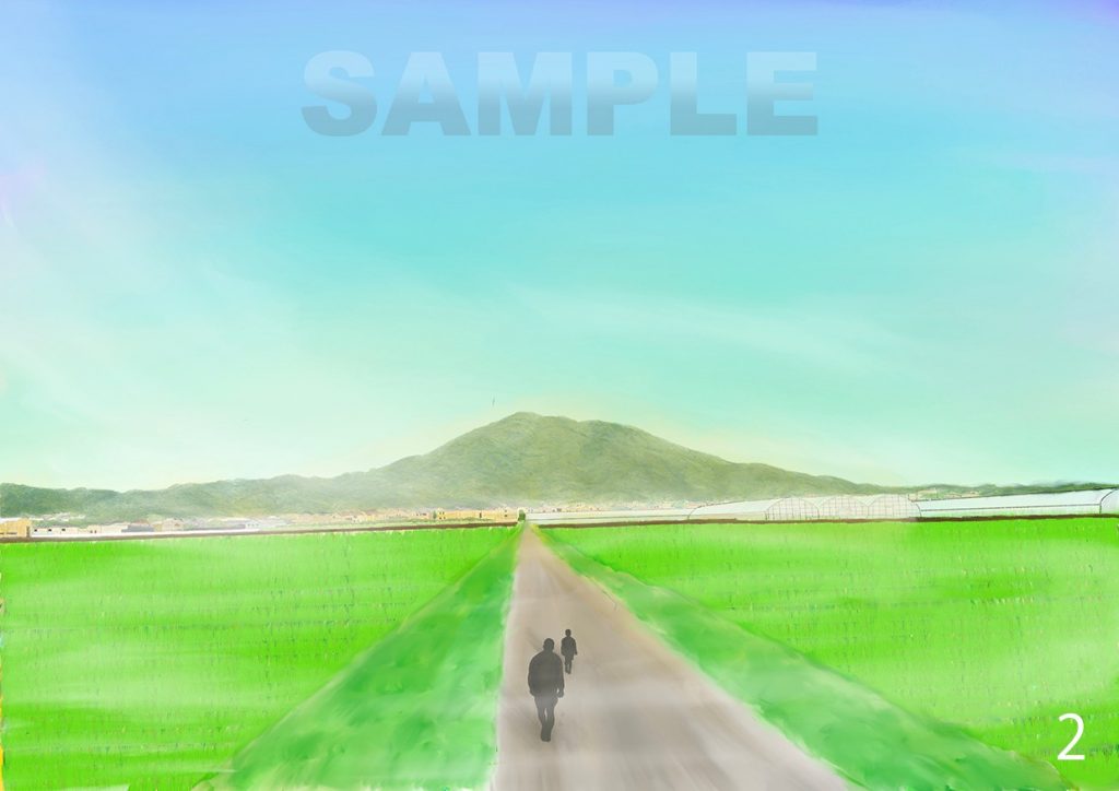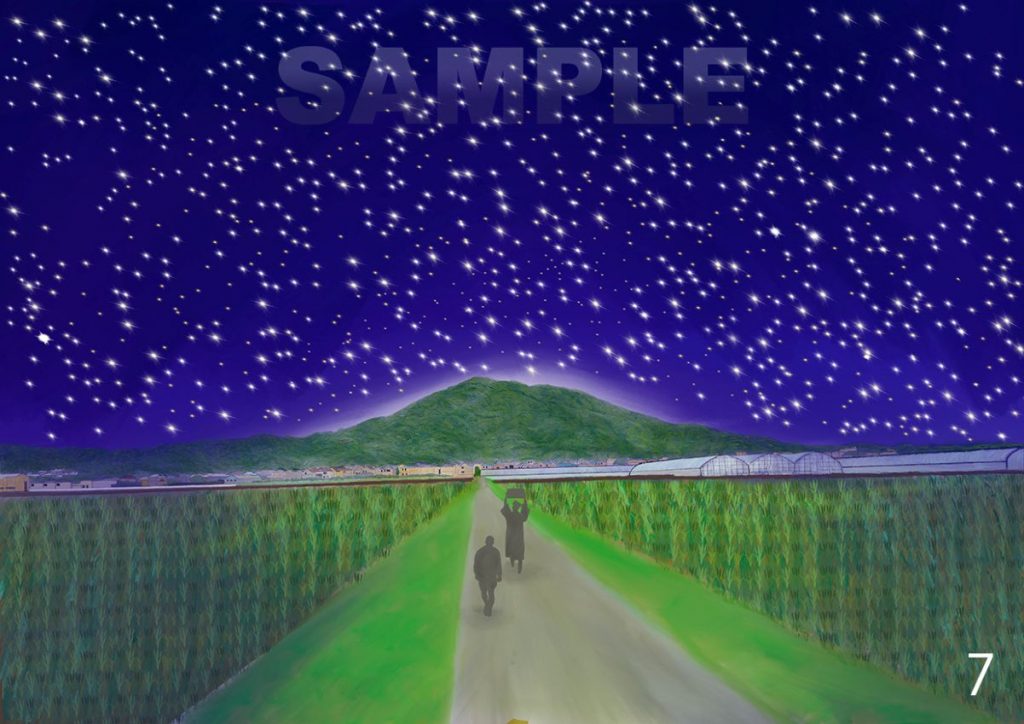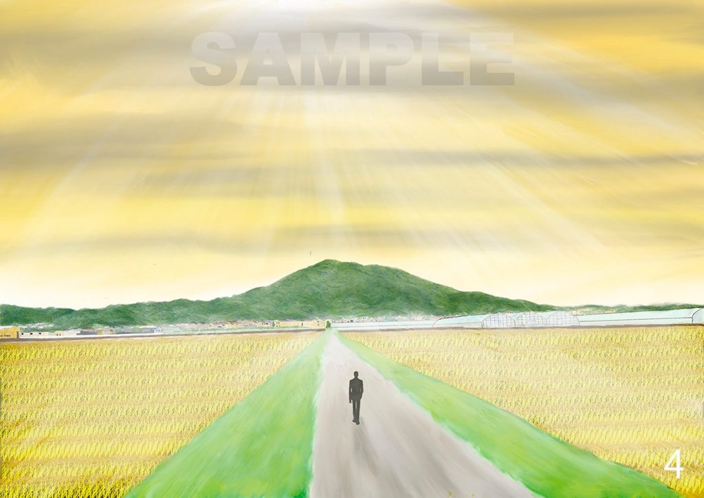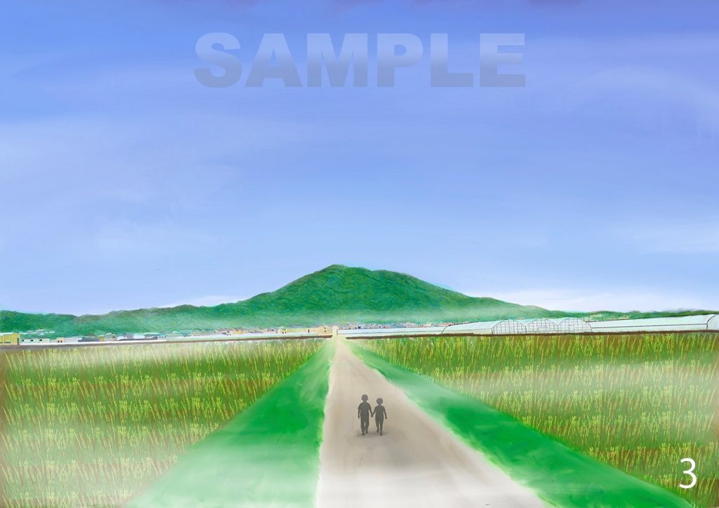 電子ペンで描いたデジタルペインティング。今回は、可也山へと続く一本道を舞台に、四季の光と人の歩みを描いた8枚の連作。