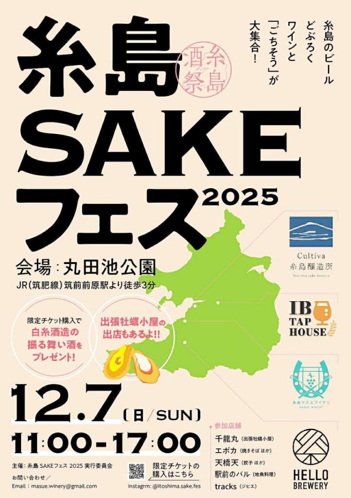 糸島市内では2022年以降、クラフトビール3社、ワイナリー1社、どぶろく1社など、新たな醸造元が次々とオープン。多彩な醸造文化を、公共交通で気軽にアクセスできる場所で楽しめる貴重な機会となる。さらに、当日会場で使える2500円分のチケットを事前購入すると、市内の老舗酒蔵「白糸酒造」によるふるまい酒1杯がプレゼントされる特典も。