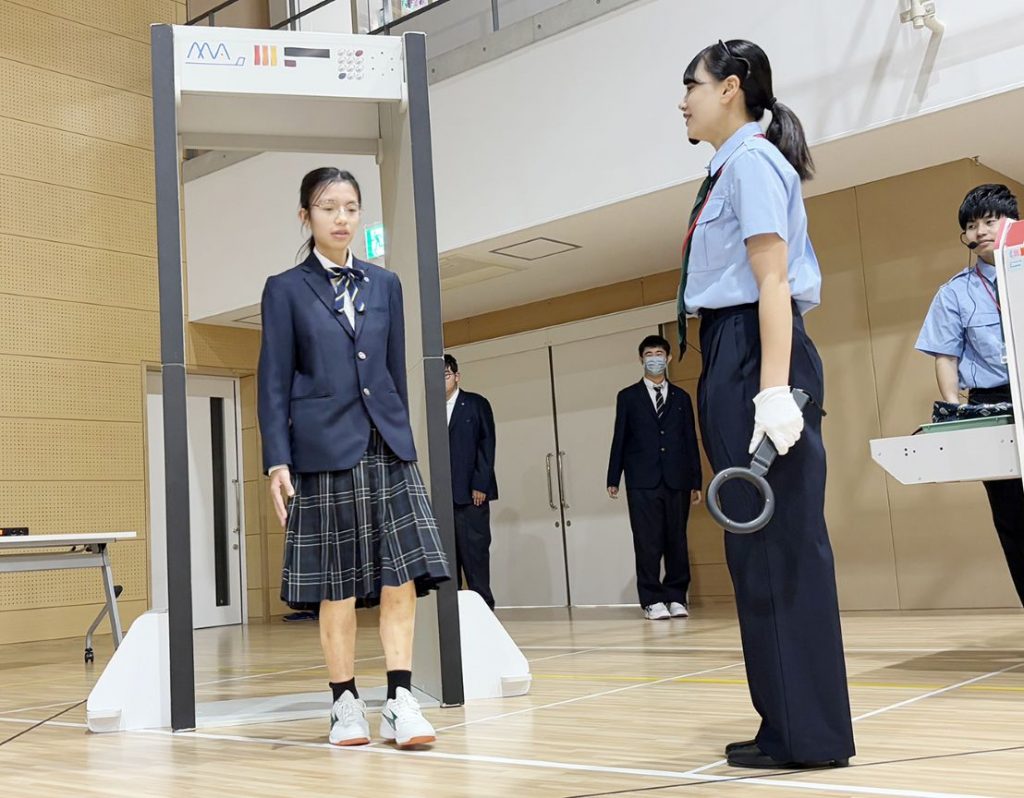 保安検査の疑似体験では、生徒がポケットにスマートフォンを入れた状態でゲートをくぐると「ピーピー」と音が鳴り、検査官役のスタッフから金属探知検査を受けた。シートベルト体験では、客室乗務員から説明を受けながら、ベルトの調整をした。