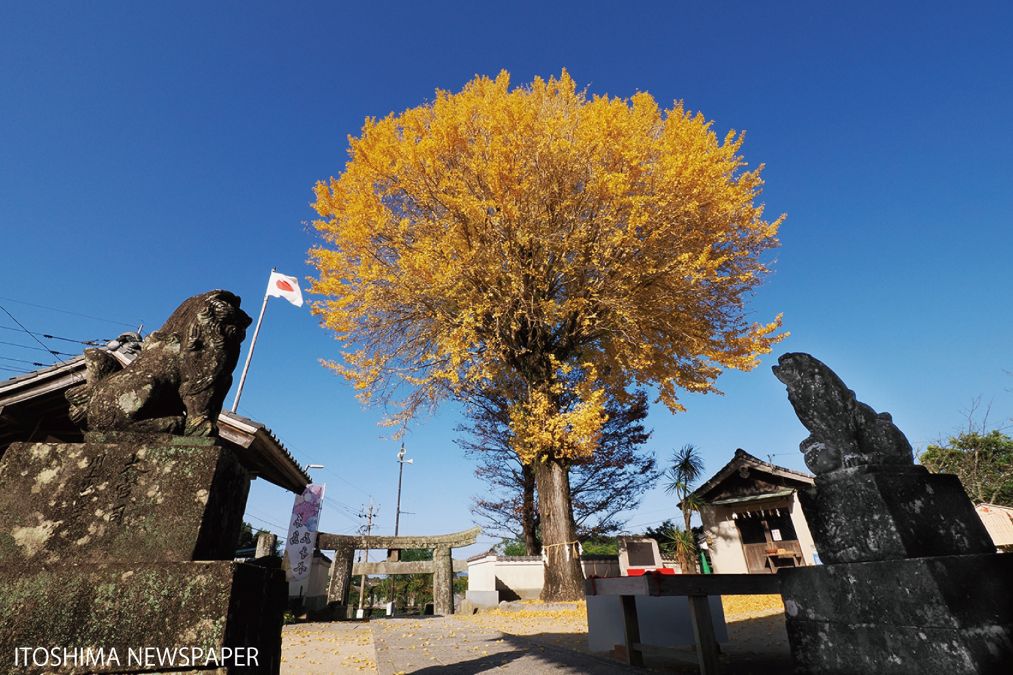 イチョウの花言葉は「荘厳」。青空を背に、黄金色に輝くさまは威風堂々としている。糸島市二丈福井の白山神社にそびえる大イチョウ。見上げる参拝者を晴れやかな気分にしてくれる。