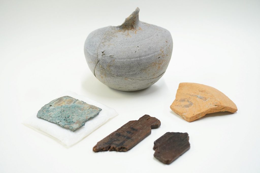出土品の中でも、市内初となる青銅製鉸具(残存長4.6センチ、幅3.5センチ)は、古代の律令制において公的な地位を持つ役人が着用した帯「銙帯(かたい)」の留め具であり、ほかにも、大宰府へ納入する物資に付けられた荷札木簡2点には、赤外線分析により墨痕を確認。「糯ヵ(うるちか)」「三斗…」といった文字が読み取れた。