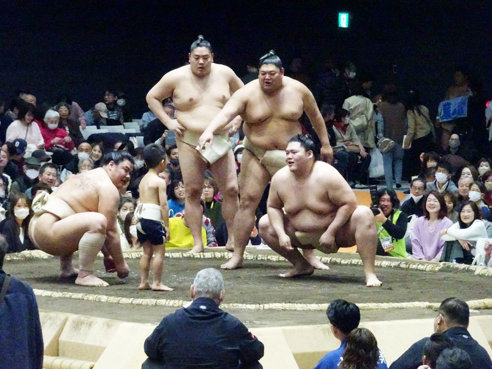 関取が地元の保育園の園児に胸を貸す「子供稽古」もあり、5歳児の男の子たちが山のような力士を押し出すと、客席からは大きな拍手が起こった。同園の橋川英叶(えいと)さん(6)は「おすもうさんは大きかったけど、本気出したら勝てた」とにっこり。