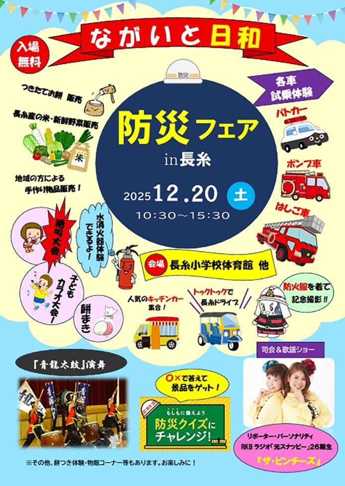 自然豊かな長糸の魅力をPRしようと、「ながいと日和 冬まつり~防災フェアin長糸~」(長糸校区運営委員会主催)が20日、糸島市の長糸コミュニティセンターと長糸小で開かれる=写真はチラシ。