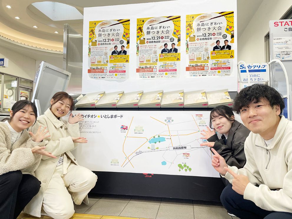 3日には、JR筑前前原駅でインターン生によるイベント告知の構内放送の録音が行われた。鹿島敬宏駅長が「駅から歩いて来られる商店街でのイベント。一緒にまちを盛り上げたい」と協力。改札横には、駅利用者がおすすめスポットを書き込める「みんなのイチオシいとしまボード」も設置した。