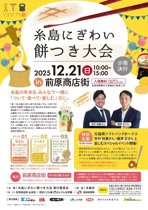 会場の一部は歩行者天国となり、来場者が餅つきを体験できるほか、つきたて餅の振る舞いや3回に分けた餅まきも行われる。特別ゲストとして、元福岡ソフトバンクホークスの吉村裕基さん、攝津正さんが登場。野球上達のコツや、野球と餅つきの「意外な関係」など楽しいトークショーも。また会場内では、糸島の特産品やアスリートのサインボール等が当たるスタンプラリーやガラポン抽選会も実施され、年の瀬の商店街が師走の雰囲気に包まれる。