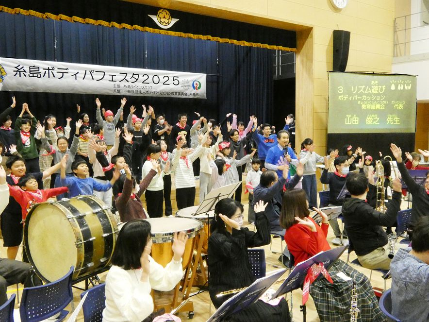 糸島特別支援学校の児童・生徒と、地元の子どもたちが手や体を叩いて音を出し、リズムを奏でる「ボディパーカッション」を通して交流を深めるフェスタが13日、糸島市泊の同校体育館で開かれた。糸島フィルハーモニー管弦楽団の演奏に合わせ、児童・生徒らは弾けるような笑顔を見せながら、元気いっぱいに手拍子を打ったり、足踏みをしたりした。