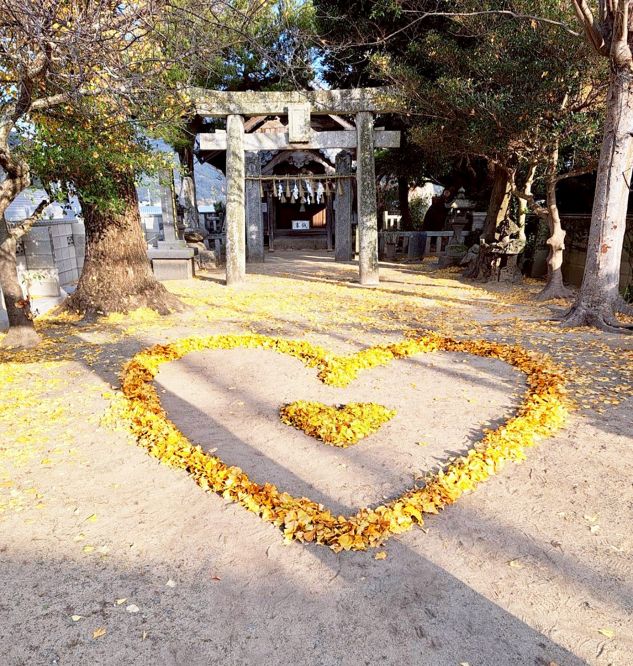 初冬のやわらかな日差しが注いだ今月初旬、糸島市岩本の西宮神社で鳥居をくぐると、イチョウの葉で縁取られた大きなハートが参拝者を出迎えた。