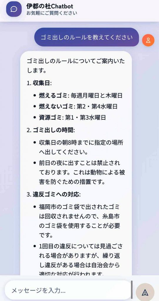 「地域の集会所を使いたいけれど、いつまでに申し込めばよかったかな」「申し込みは使用日の3日前までです」-。そんな住民からの問い合わせに、24時間いつでも答えてくれる人工知能(AI)技術を活用した「自治会チャットボット」が、糸島市の伊都の杜自治会で動き出した。