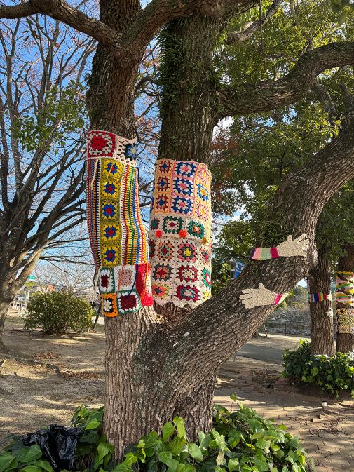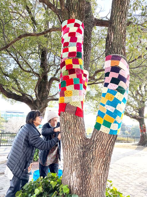 公園で飾りつけを見た人からは「木が腹巻を巻いている!」「カラフルで温もりを感じる」といった声も。 メンバーたちは「夜はイルミネーションで照らされるけど、昼は毛糸に包まれた木を見て温かな気持ちになってもらえたら」と話している。飾り付けは来年3月3日まで。