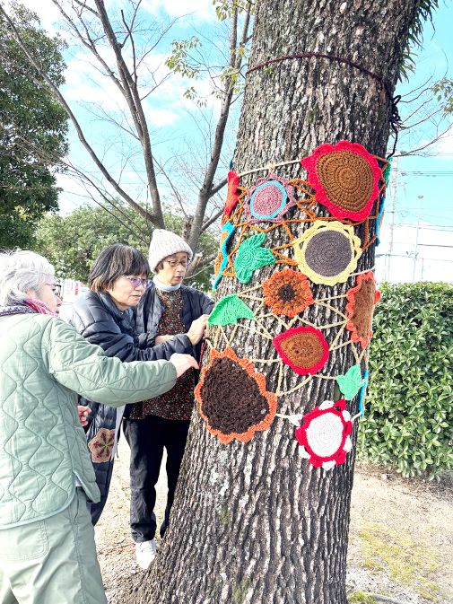 ヤーンボミングは、カラフルな編み物で木など飾り付けるストリートアート。アメリカやイギリスで広まり、近年は日本各地でも実施されている。同会のこぼりかおるさん(71)が「木や人に優しく、電気も使わない」と発案し、2023年から同会のメンバーで飾り付けをしている。
