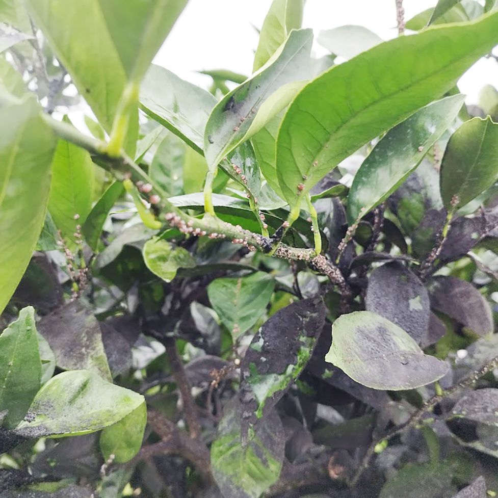 柑橘などの常緑樹にカイガラムシが発生すると、葉についた排せつ物に菌が繁殖し、すすをつけたように、黒く変色してしまいます。直接的な葉の病害ではありませんが、葉が黒く覆われてしまうので、光合成機能が損なわれ、結果として樹勢がどんどん衰えてしまいます。また、柔らかい枝に寄生し、樹液を吸うため、枝が枯れ始めていきます。特に、剪定(せんてい)作業などの管理が遅れ、幹全体の通気性が損なわれると、幹の中心部当たりからの発生が多くなります。