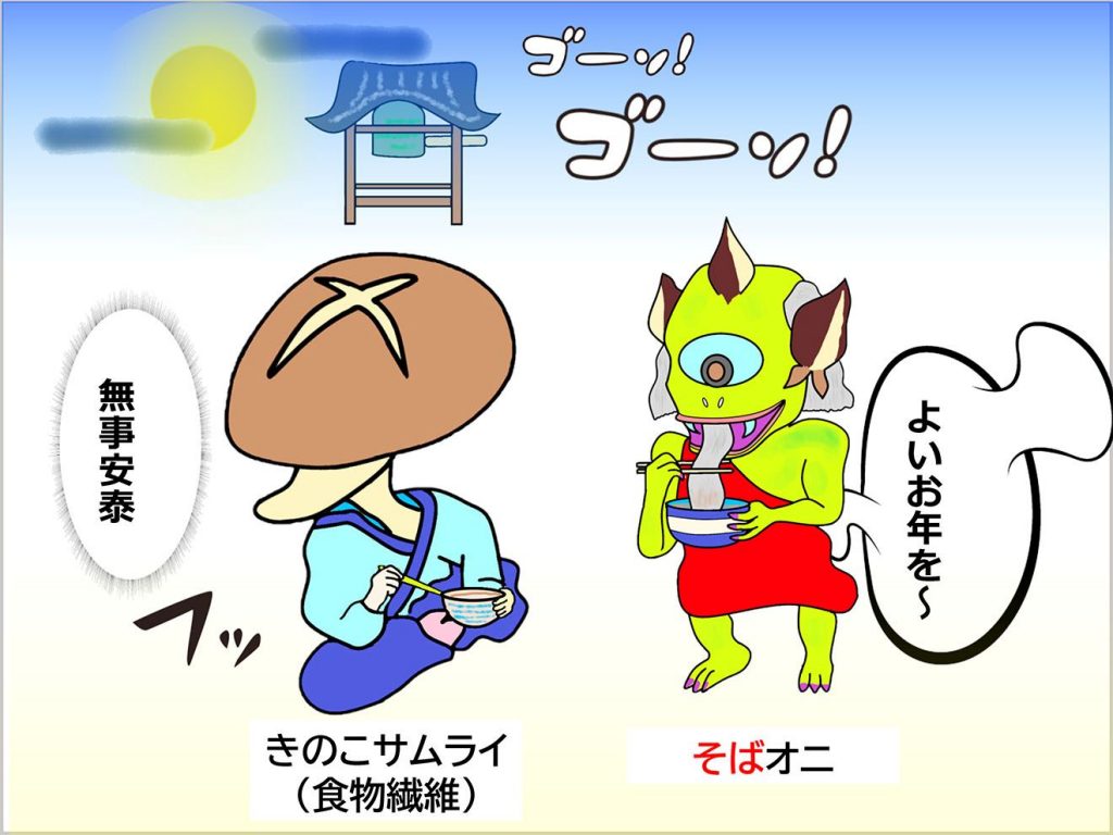 さて、一年の締めくくりの食べ物と言えば「年越しそば」。そばは長く切れやすいため、「一年間の厄災や苦労を断ち切る」「長寿を願う」「金運を招く」食べ物とされ、年越しそばには、新年を気持ちよく迎えたいとの願いが込められているそうです。そばには疲労回復につながる「ビタミンB群」、腸内環境を整える「食物繊維」などが含まれ、年末の疲れた体を癒やしてくれる食べ物です。「八割そば」や「十割そば」などを選ぶとこれらの栄養が多く含まれますので、裏面表示などを確認して選びましょう。一年間、頑張ってくれた自分へのご褒美として「おいしい年越しそば」を食べて、よいお年をお迎えください。