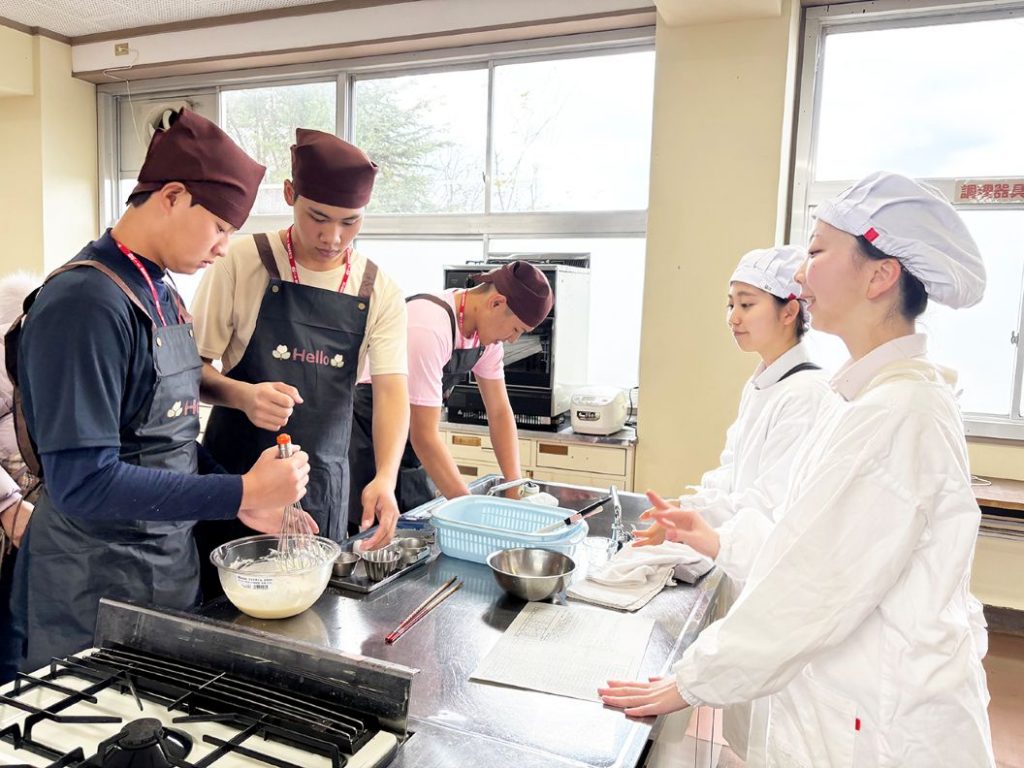 チーズケーキ作りを教えた生活科学科2年の藤ひなのさん(17)は「『ミックス』などの英語やジェスチャーを使うと、思っていたより話が通じた。日本のアニメの話など共通の話題でも盛り上がり、とても楽しかった」と振り返った。