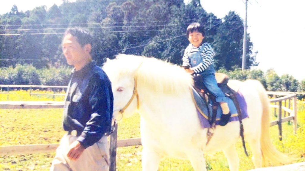 裕里恵さんが馬に興味を持ったのは3歳のころ。佐賀市三瀬村のどんぐり村であったポニーの引き馬体験は、3歳以上が条件だった。誕生日を迎え、念願かなって初めて馬に乗った裕里恵さんは満面の笑み。母の尚美さんは当時を振り返り「自分より何倍も大きい馬を、全く怖がる様子がなくて。よくせがまれて連れて行っていた」と懐かしむ。