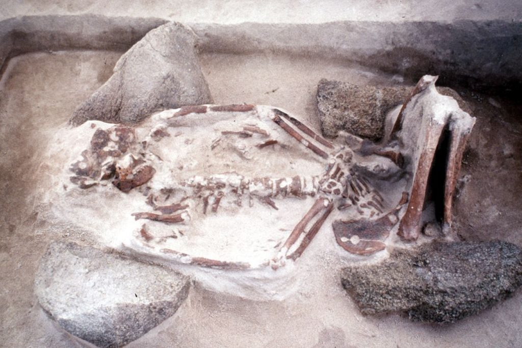 遺体は膝を曲げて葬られ、頭部には水銀朱が塗布されていた。脇にある石は木棺の底を支えていた台石