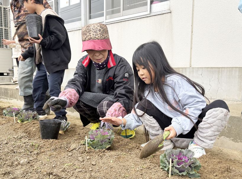 作業には地域のシニア11人も参加し、「しっかり土をかぶせてね」などと声をかけながら、子どもたちを見守った。植え付け後、児童たちは「丁寧に教えてくれてありがとうございました」と感謝の言葉を伝えた。