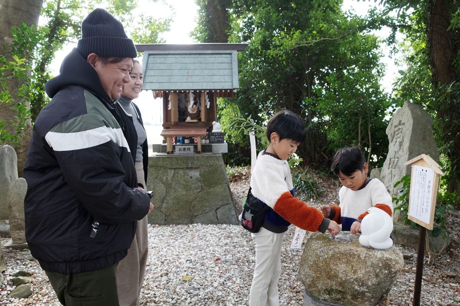 板持の上村さん家族は「夫婦の干支(えと)が辰と巳で、龍宮伝説がある御祭神の豊玉姫命(とよたまひめのみこと)と、弁財天の化身とされる白蛇を祭る志登神社に縁を感じ、2年前からお参りをするようになりました。神社のご加護か、暮らしが豊かになった気がします」と話し、仲良く銭洗いするわが子を穏やかな表情で見守っていた。
