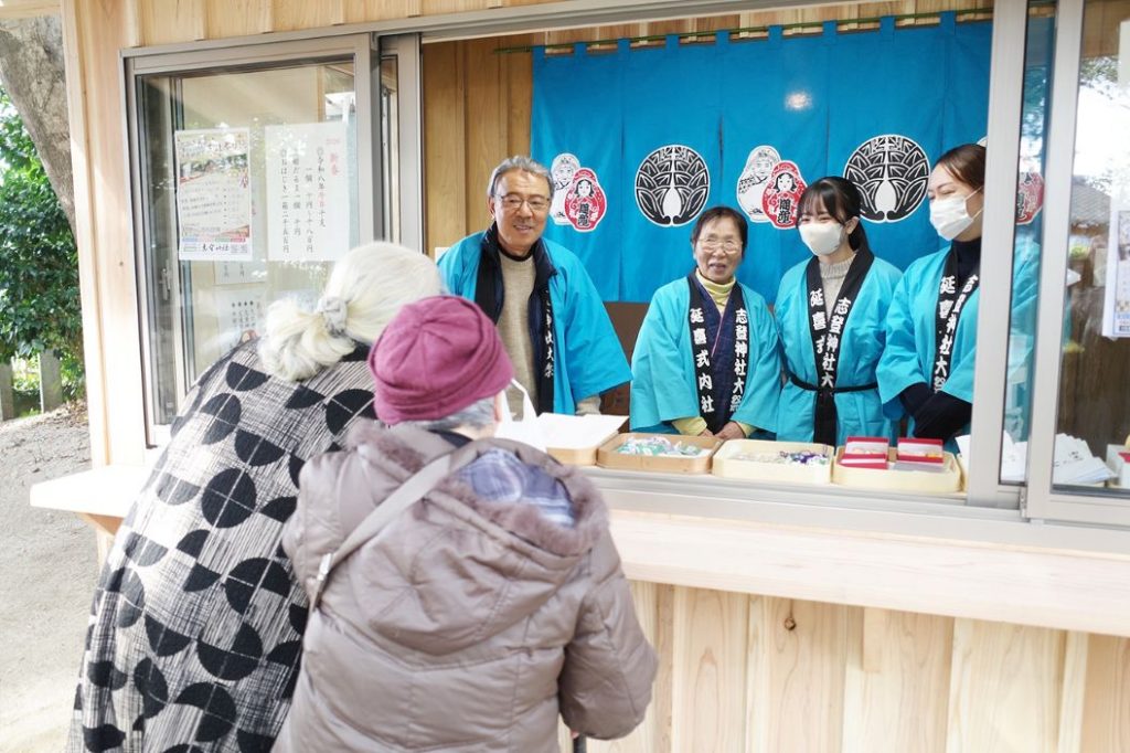 昨年12月に新設されたばかりの社務所では、総代の岩隈道生さんと地域の人たちが笑顔で新年の挨拶を交わし、氏神として1100年余り地域に親しまれる神社の温かな正月の風景が広がっていた。