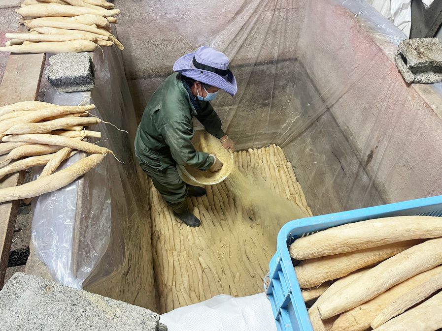 たくあんの仕込みが本格化する冷え込みの厳しい1月21日、漬物製造施設には、天日干しされた大根のやさしい香りが満ちていた。たくあん用の大根が干し上がり、この日から漬け込み作業が始まった。