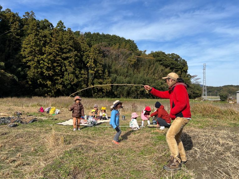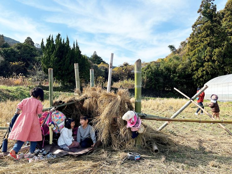 この日の給食は園で育てた新米ということもあり、炊く前のお米を観察したあとは田んぼへ移動。子どもたちが自由にアイデアを出し合って作った藁(わら)の家ではおうちごっこ、折り紙、縄跳びなどそれぞれのやりたいことが始まった。「自分の発達段階に合った遊びを選ぶようになります。近づきすぎず見守って、必要な子には声をかけに行きます」と矢野さん。