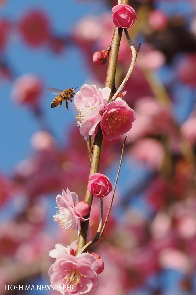 春めいた穏やかな日差しに誘われ、可也山南麓の小富士梅林を訪ねてみることにした。梅林に向かう途中の道沿いで、満開になった枝垂れ梅を見かけた。青空に映えるピンクの花々。ミツバチが花蜜を求め、その周りを飛び回っていた。足には、巣に持ち帰るための、まだ小さな花粉だんご。かすかなやさしい羽音が春の訪れを告げる。